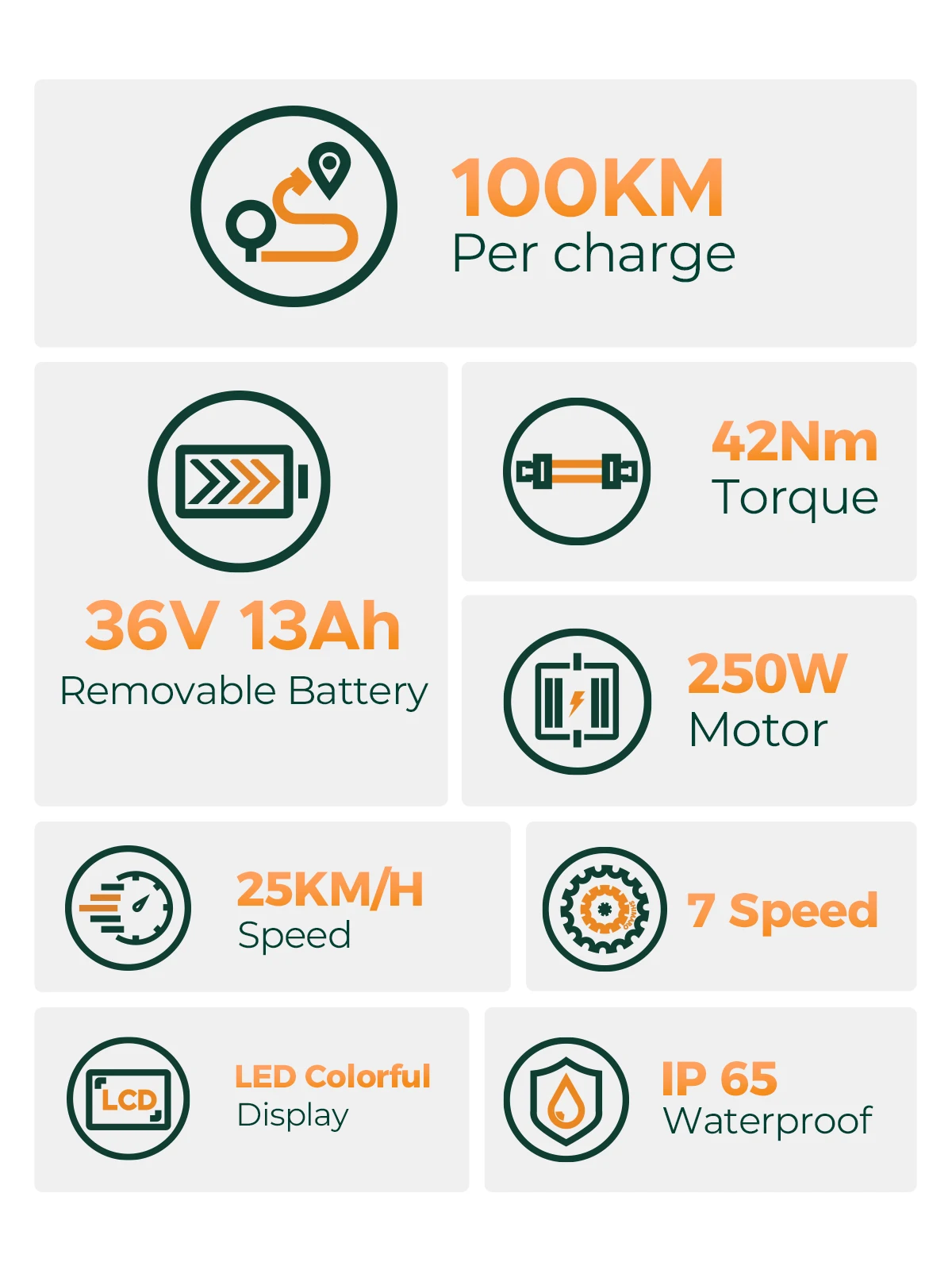 ✔120km Range: Ride farther with a powerful 36V 13Ah battery.